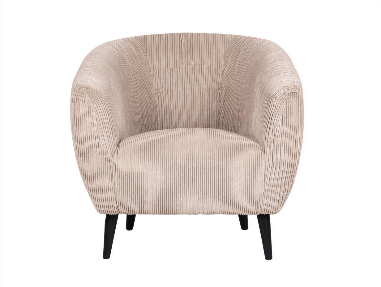 Struttura interna realizzata in materiale resistente con imbottitura generosa. Rivestimento in tessuto di colore beige con lavorazione a coste, piacevole al tatto e pensato per un utilizzo quotidiano. Piedini in metallo verniciato di colore nero che garantiscono stabilità.